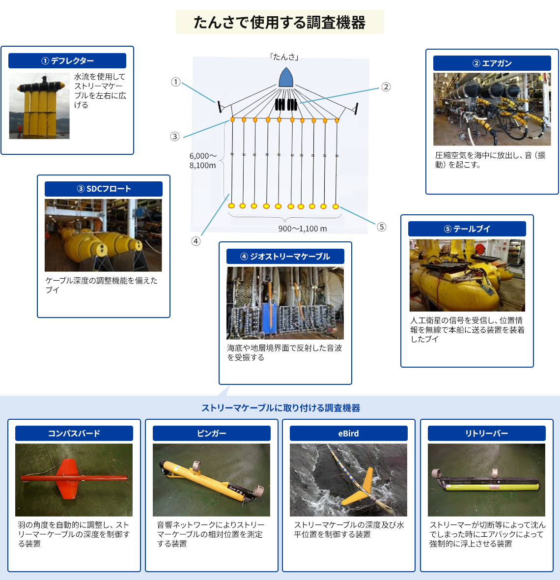 実際の海上物理探査では、船尾から曳航するエアガンより、海底に向けて弾性波を発射し、海底や地層の境界に当たって反射した弾性波を、船尾から曳航するストリーマ・ケーブルに設置したセンサーで受振して、海底下のデータを取得します。